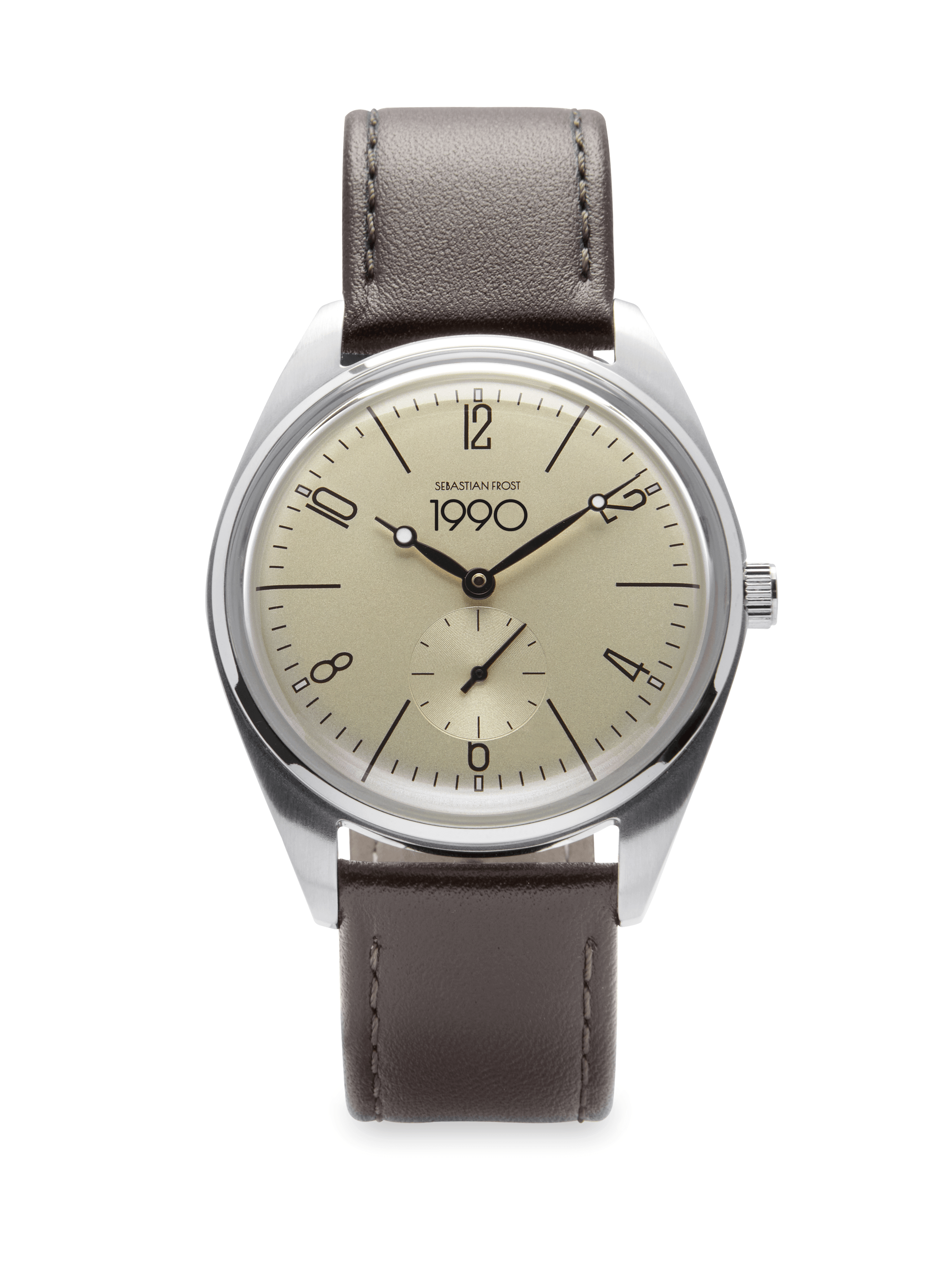 A vintage-inspired unisex watch with stainless steel casing, slightly rounded glass, a dark brown leather strap and the year number 1990 on the dial. To celebrate birthdays, graduations, wedding days and everything in between.