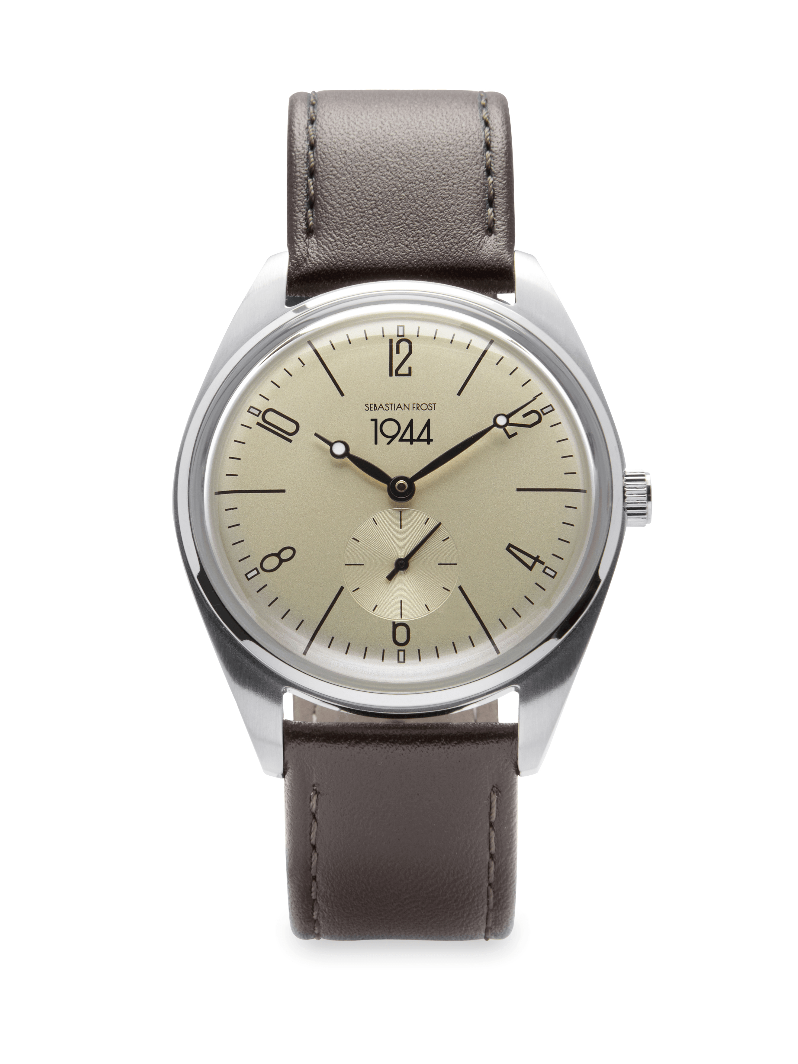 A vintage-inspired unisex watch with stainless steel casing, slightly rounded glass, a dark brown leather strap and the year number 1944 on the dial. To celebrate birthdays, graduations, wedding days and everything in between.
