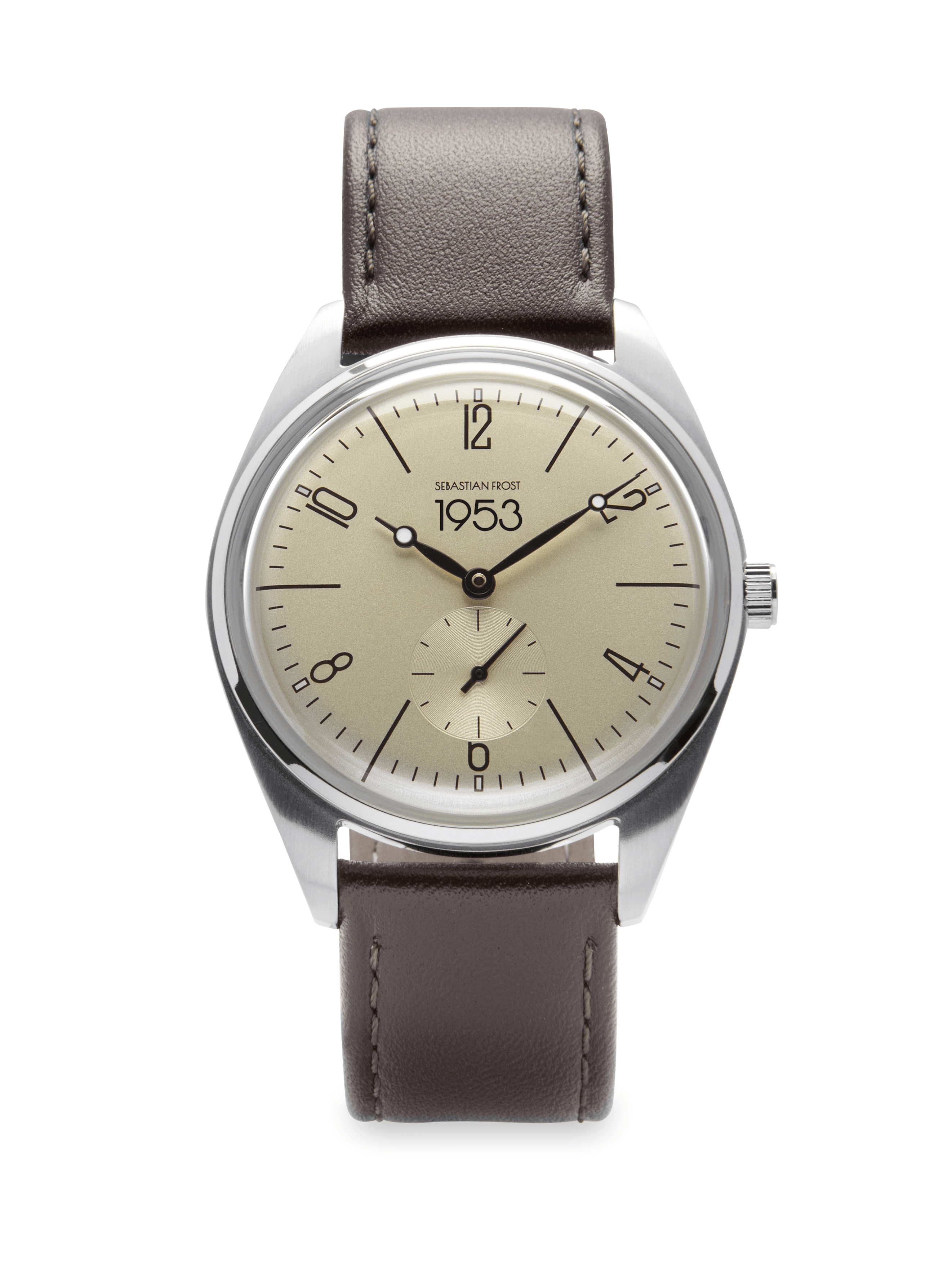 A vintage-inspired unisex watch with stainless steel casing, slightly rounded glass, a dark brown leather strap and the year number 1953 on the dial. To celebrate birthdays, graduations, wedding days and everything in between.