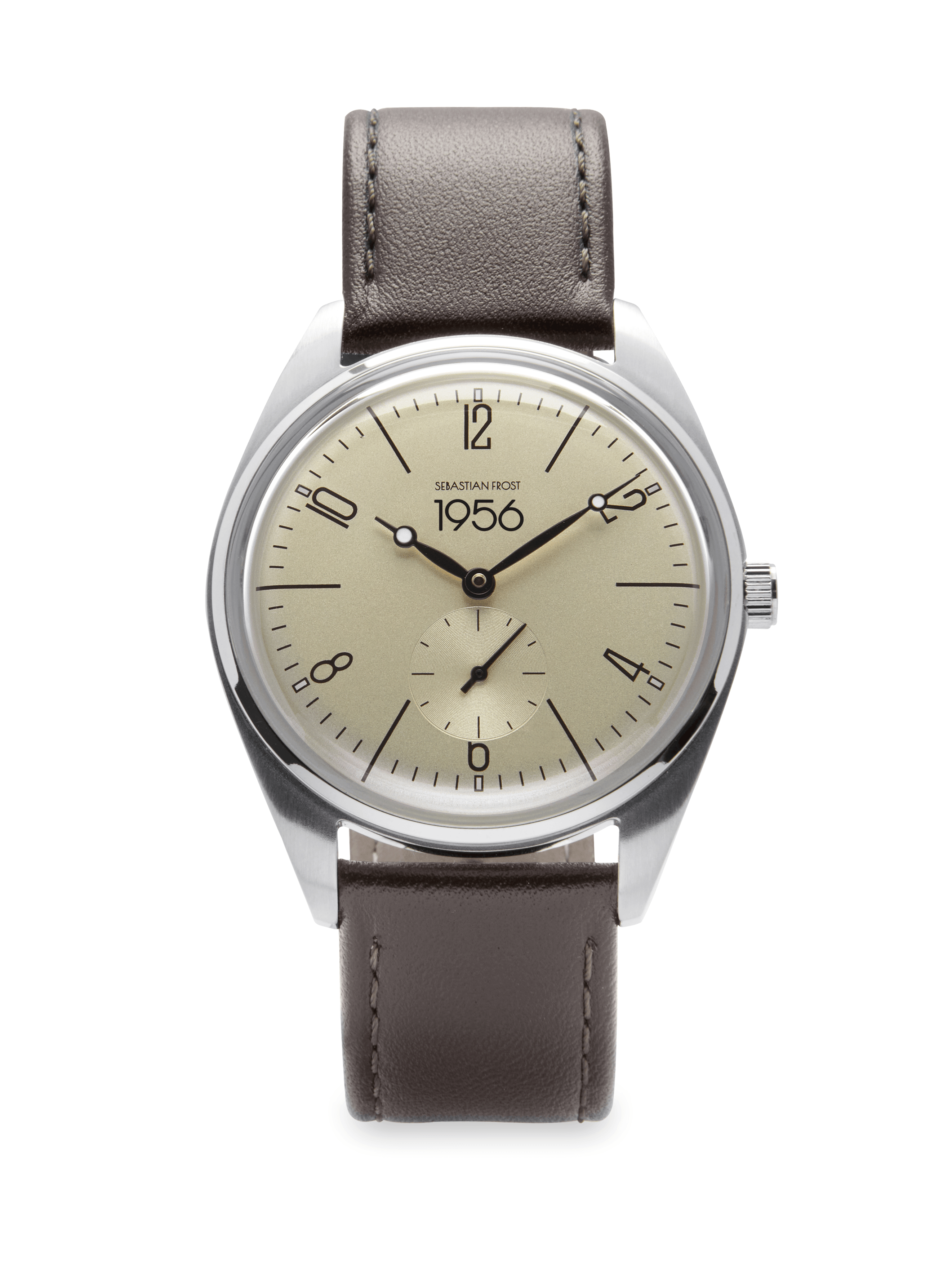 A vintage-inspired unisex watch with stainless steel casing, slightly rounded glass, a dark brown leather strap and the year number 1956 on the dial. To celebrate birthdays, graduations, wedding days and everything in between.