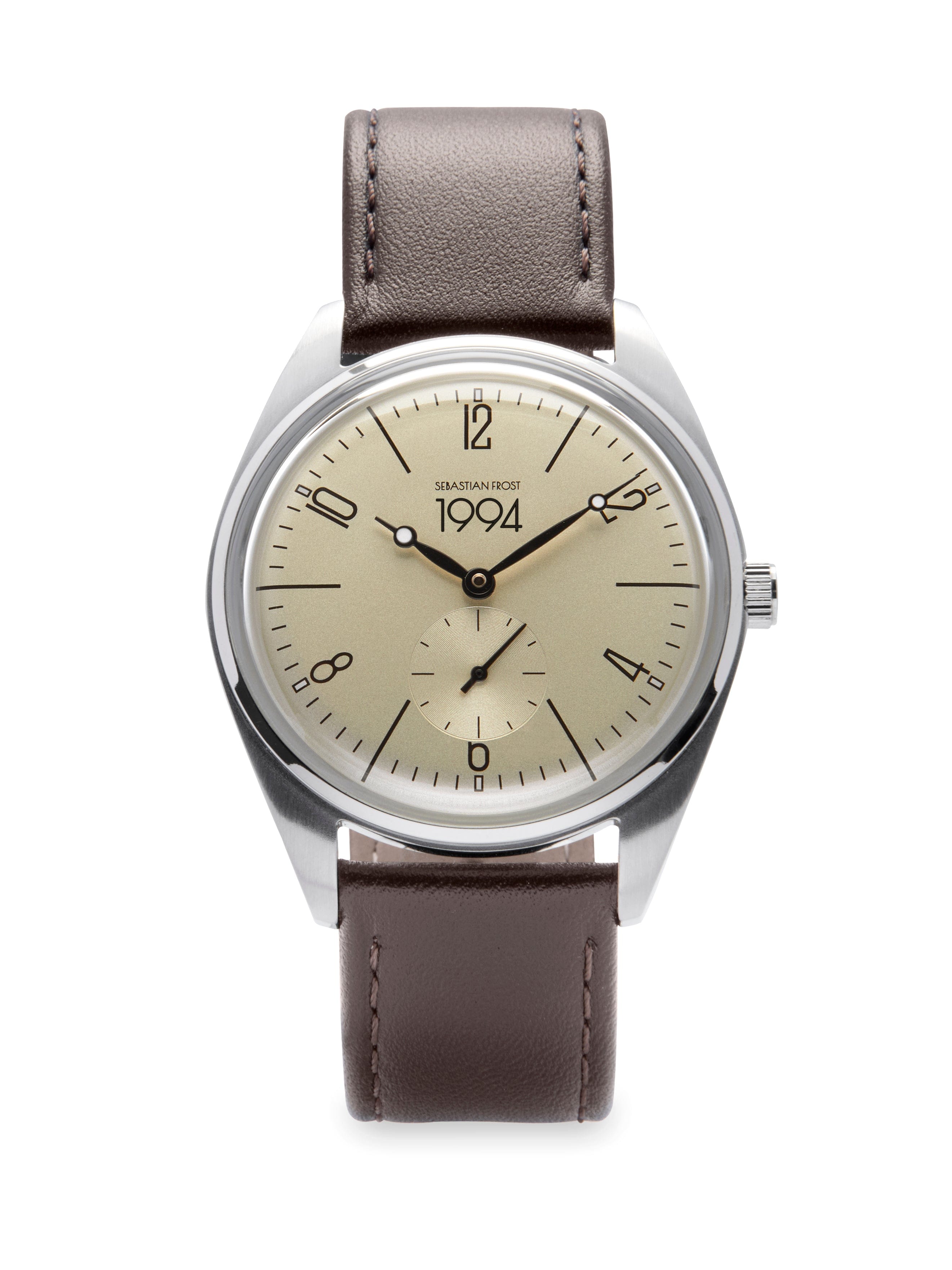 A vintage-inspired unisex watch with stainless steel casing, slightly rounded glass, a dark brown leather strap and the year number 1994 on the dial. To celebrate birthdays, graduations, wedding days and everything in between.