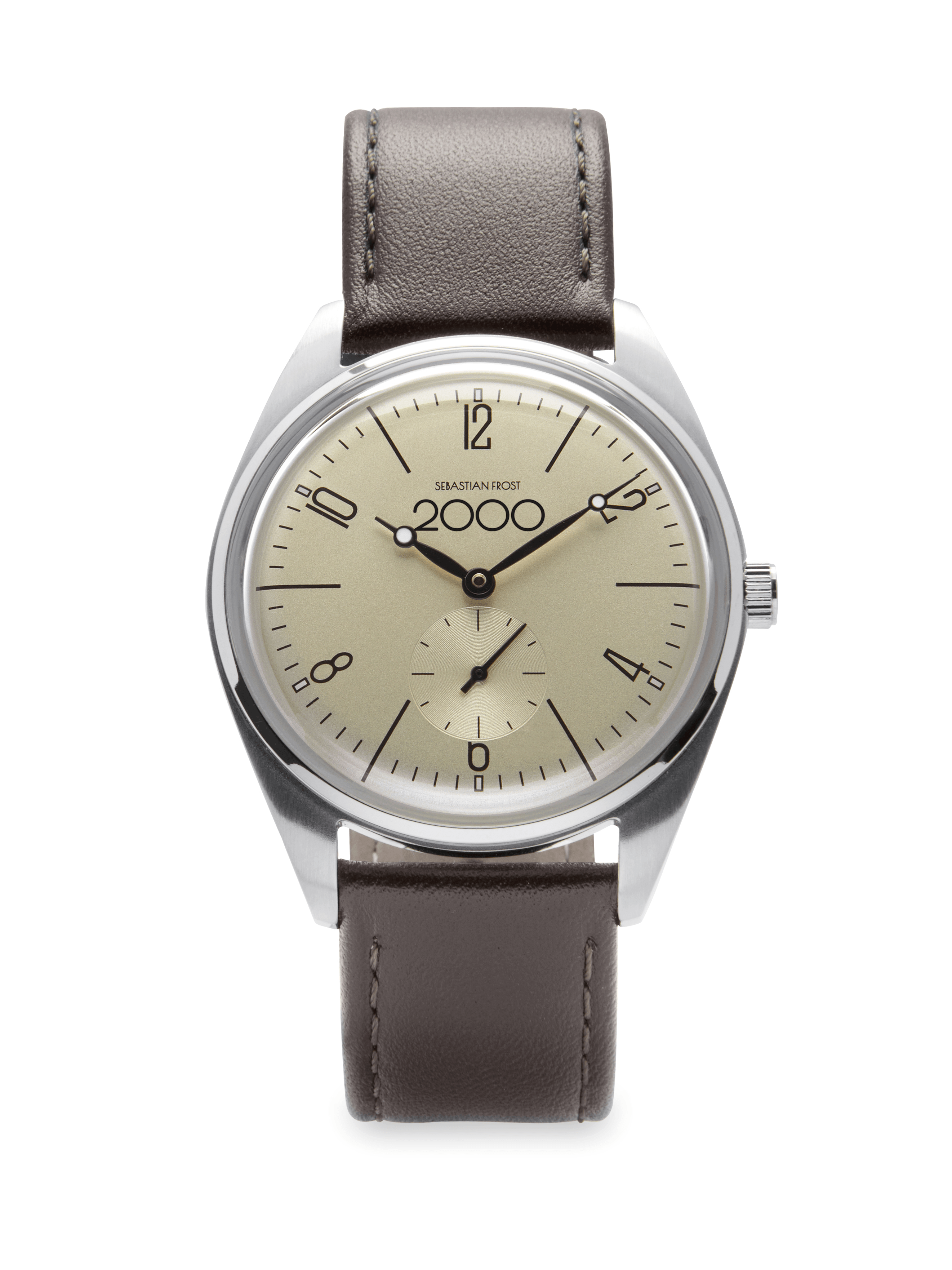 A vintage-inspired unisex watch with stainless steel casing, slightly rounded glass, a dark brown leather strap and the year number 2000 on the dial. To celebrate birthdays, graduations, wedding days and everything in between.