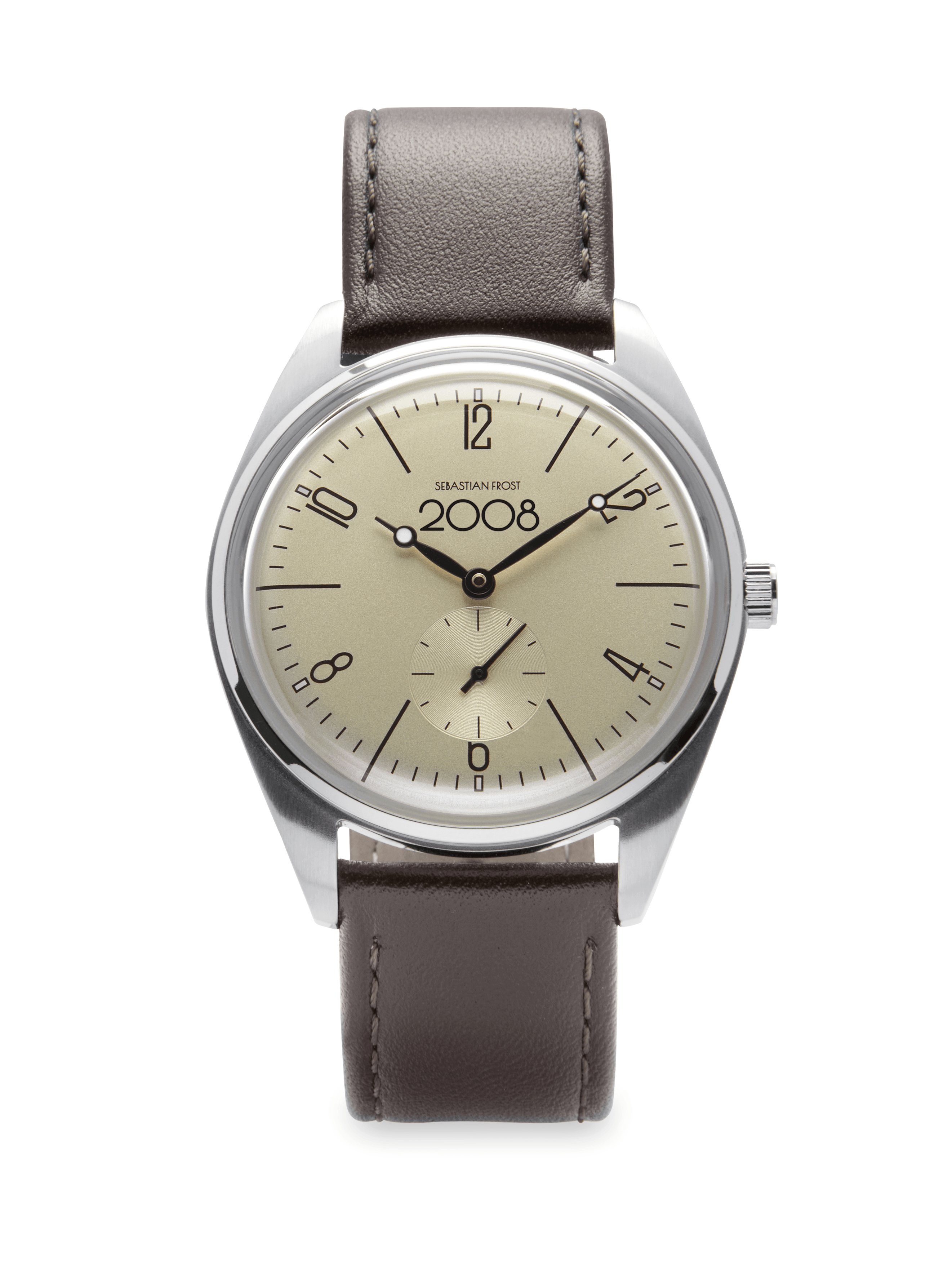 A vintage-inspired unisex watch with stainless steel casing, slightly rounded glass, a dark brown leather strap and the year number 2008 on the dial. To celebrate birthdays, graduations, wedding days and everything in between.